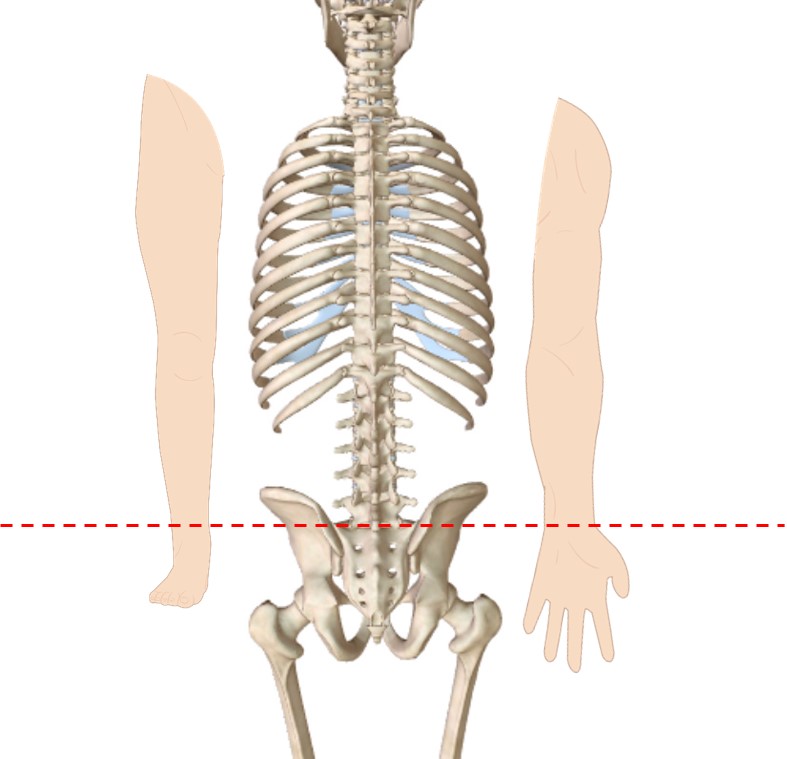 1. הדמיה רגילה של גפה (יד / רגל) לפלג גוף עליון. בהדמיה זו, הכתף / מפרק הירך מדמים את איזור T1, המרפק / ברך מדמים את גובה L2-3, מפרק כף היד / קרסול מדמים את L5-S1, וכף היד / רגל – מדמים את הסקרום.