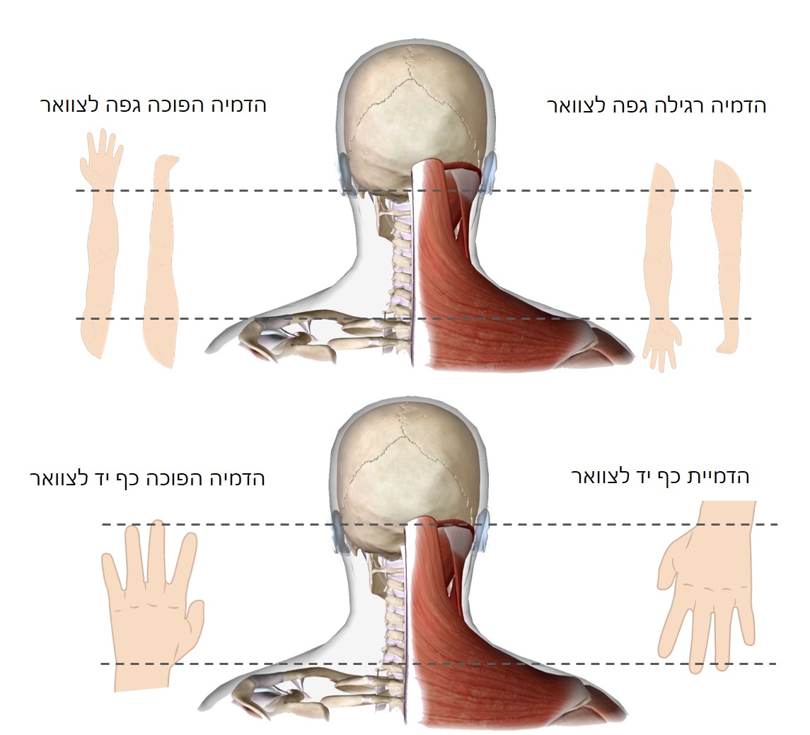 אפשר לדמות את קצות האצבעות לקצה העליון של הצוואר או הראש, ואת בסיס שורש כף היד או קרסול – לחלק התחתון (ולהיפך).