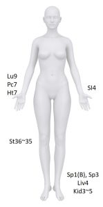 2. לגב תחתון – L – SI4, Kid3, Liv4 + R – Pc7, Ht7 (Lu9) ודיוק אשי באיזור   שבין Kid3~5  (שמאל).